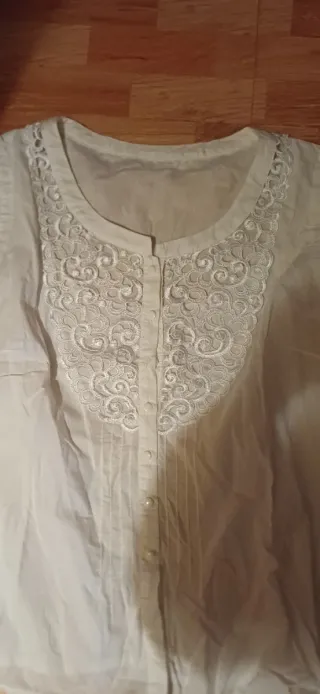 Elegante blusa con un diseño cruzado y un delicado bordado floral. Blusa blanca de algodon, cruzada en el delantero y con lazada para anudar. Lleva bordado de flores en azul marino ribeteando los bordes del delantero. Tirilla en el cuello. Manga larga con puño. Talla L