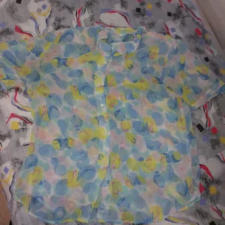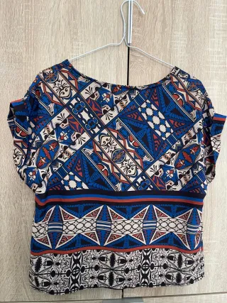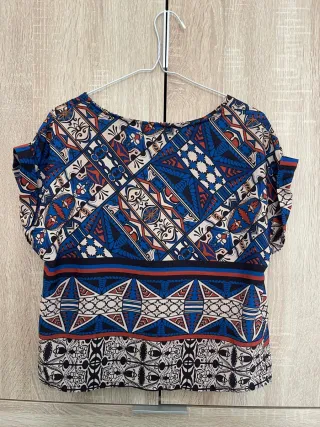 ✨ Blusa estampada única M/L – estilo original de tienda local ✨ Preciosa blusa de tienda local, con un estampado geométrico muy llamativo en tonos azul, rojo y beige que combina fácilmente con jeans, faldas o pantalones. 🔹 Talla: M/L (queda suelta y cómoda) 🔹 Manga corta con detalle doblado 🔹 Tejido ligero y fresco, ideal para primavera y verano 🔹 Diseño original difícil de encontrar en tiendas grandes 🔹 Muy favorecedora y cómoda para el día a día 💙 Perfecta para darle un toque especial a cualquier look. 📏Medidas: axila a axila 50 cm De cuello hasta abajo: 45 cm