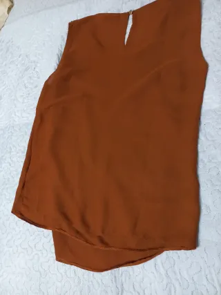 Blusa de gasa sin mangas en color marrón. Su diseño ligero la hace ideal para cualquier ocasión. - Tejido de gasa. - Sin mangas. - Cuello redondo con abertura y botón.
