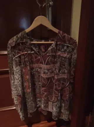 Blusa de manga larga con un llamativo estampado. Aunque pone talla S da hasta la XL sin problema , es ancha. - Diseño con cuello camisero. - Cierre de botones. - Puños abotonados.