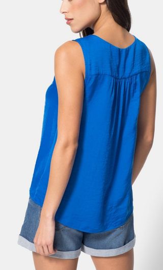 Top sin mangas de bonito color azul klein. Cuello pico y botones decorativos en la parte delantera. Tejido que no necesita plancha. Es de Tex talla S, y aún conserva la etiqueta.