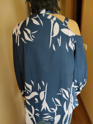 Blusa azul marino con estampado de plantas y cuello asimétrico. Está sin usar.