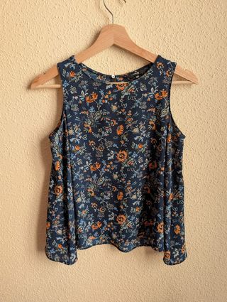 Preciosa blusa sin mangas de Terranova, talla S. Es de color azul oscuro con estampado floral en tonos naranjas. Luce impecable y tiene un corte favorecedor. - Cuello redondo - Sin mangas - Corte amplio