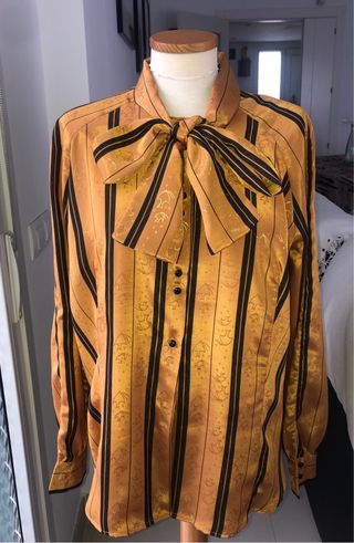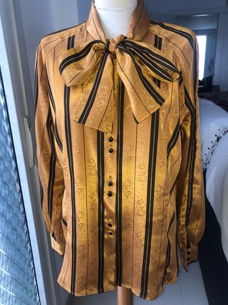 Blusa de mujer, satén, manga larga, confeccionada por modista, cuello con lazo Dorada y negra, con estampado fino. Talla XL