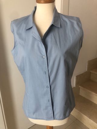 Preciosa blusa de color azul claro, sin mangas. Distancia entre hombros 40 cm Diatancia entre axilas 52 cm - Cuello clásico con botones. - Corte recto. - Algodón y poliester