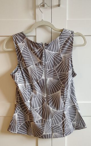 Preciosa blusa sin mangas de la marca HyM, en talla 38. Es de color gris y blanco con un estampado geométrico. - Diseño elegante y favorecedor. - Confeccionada en tejido ligero y agradable al tacto. - Cierre de cremallera en la espalda.