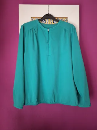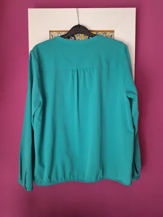 Blusa Zara talla L, sin etiquetas interiores por molestas. De color verde azulado, sutiles pliegues en hombros, espalda y mangas, goma suave en el bajo y abertura frontal con corchetes (cerrada al 50% para que no se vea el sujetador, en abrirla de nuevo se tarda un minuto). Tejido sintético y fresco de secado rápido. Medidas: hombros 40 cm, mangas 59 cm, axilas 50 cm, largo 61 cm.