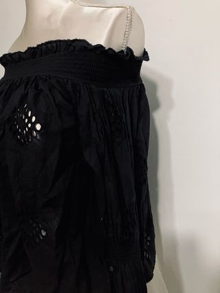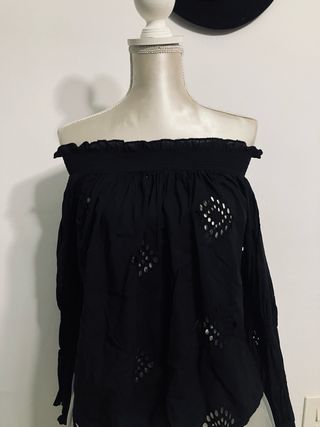Elegante blusa sin hombros de Zara con un diseño calado. - Manga larga. - Escote elástico. - Detalle de calados en forma de rombos y flores.