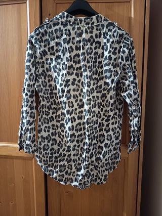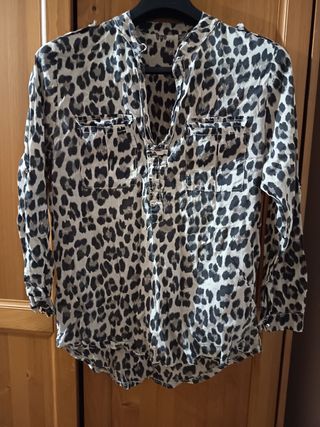 Blusa con estampado de leopardo y manga larga. - Mangas recogibles con tira y botón dorado - Cuello mao y de pico - Dos bolsillos con solapa en la parte delantera. - Mide de pecho 52 cms, de hombro a hombro 44’5 cms, de largo 66 cms por delante y 79 por detrás y caderas 50 cms, manga 49 cms de largo. - Usada, en buen estado.