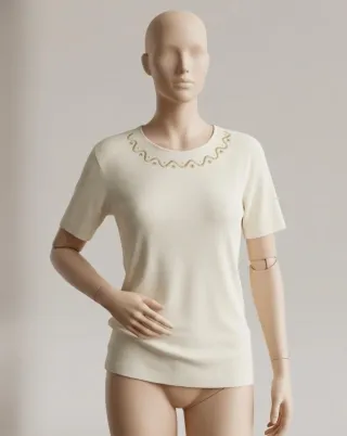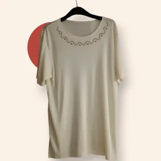 Blusa de mujer con un diseño elegante y detalles en el cuello. - Cuello redondo con adornos. - Manga corta. - Tejido ligero y cómodo. Medidas :52 hombro, 73 largo, 53 ancho aprox〽️