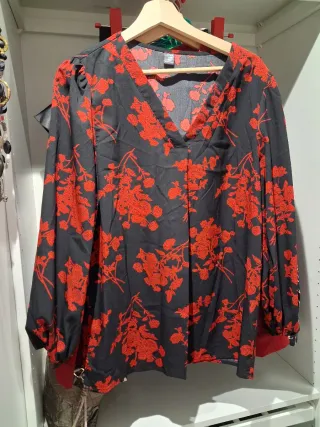 Blusa con un llamativo estampado floral en tonos rojos y negros. Presenta un escote en V y mangas largas abullonadas. - Diseño con estampado de flores rojas sobre fondo negro. - Cuello en V. - Mangas largas con detalle abullonado en el hombro.