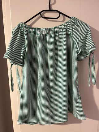 Blusa de mujer con un diseño a rayas verdes y blancas. Es una prenda cómoda y con estilo. - Escote Bardot. - Mangas cortas abullonadas con lazo. - Tejido ligero. Sin marca Medidas 40 cms de hombros y 50 cms de longitud