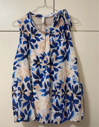 Elegante blusa sin mangas con un estampado floral vibrante. Perfecta para añadir un toque de color a tu armario. - Diseño con cuello fruncido y lazada en los hombros. - Tejido ligero y fluido. - Estampado de flores en tonos azules y beige.