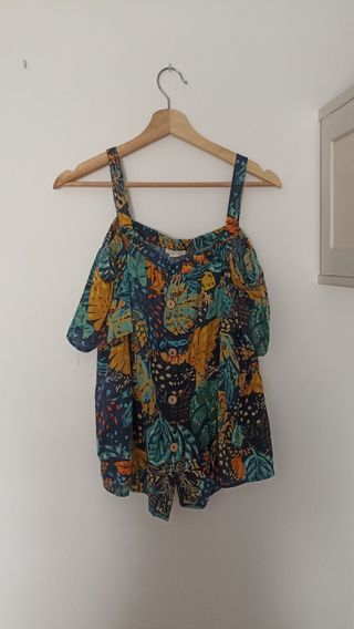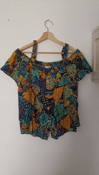 Blusa azul marino con estampado vegetal tipo jungla, en tonos azules, naranjas y amarillos. De hace unos años pero mantiene los colores vibrantes. Con hombros descubiertos, tiene mangas cortas, goma al cuello, y puede llevarse con o sin tirantes. Ideas de posición en las fotos. Cierre de botones en la parte delantera. Tejido ligero, ancho y vaporoso. Muy cómoda. 60% viscosa 40% lino