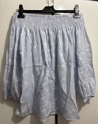 Blusa con estampado de estrellas sobre fondo de rayas. Diseño de hombros caídos y manga larga. - Tejido ligero y cómodo. - Puños elásticos. - Escote elástico fruncido.