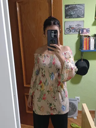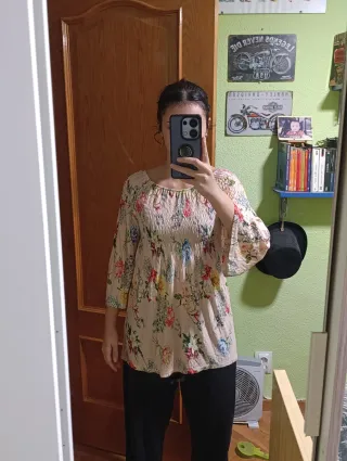 Blusa rosa clarito de manga larga con estampado floral. El pecho es de tejido de nido de abeja, elástico y los hombros se pueden bajar. Mangas acampanadas y tejido ligero. Es larga, yo la usaba de vestido bajando los hombros y también queda muy bien. Prácticamente no se ha usado.