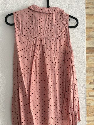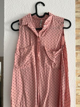 Blusa sin mangas con un diseño de lunares sobre fondo rosa. - Cuello camisero. - Cierre de botones. - Dos bolsillos en la parte delantera.
