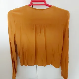 Blusa corta de manga larga con un diseño moderno y favorecedor. - Escote elástico con volantes. - Cintura fruncida. - Tejido ligero y con textura.