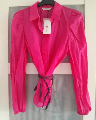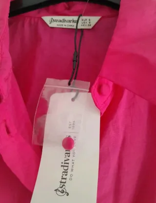 Blusa de Stradivarius con un vibrante color fucsia y un diseño elegante mangas globo Con etiqueta, botones forrados y mangas ajustables, muy cómoda y tela suave.