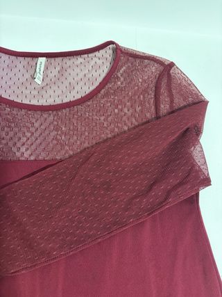 Blusa camiseta color burdeos de manga tres cuartos con un diseño texturizado y un detalle de encaje negro en el bajo. Talla M No hago reservas Bimba y lola.uterque.mango.zara.oysho.stradivarius.sprinfield.pedro del hierro.parfois.roberto verino.sfera.pull and bear.berskha.hoss intropia.purificacion García.guess.