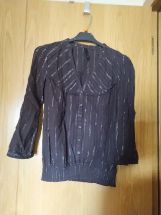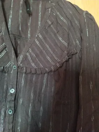 Camisa de manga larga con un diseño de rayas finas plateadas sobre fondo oscuro. - Cuello camisero. - Cierre de botones. - Puños abotonados. - Cintura elástica.