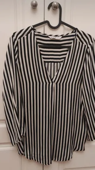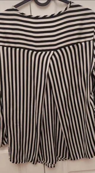 Blusa de rayas tipo raso,súper suave, largo 65, hombros 42, pecho 46, cadera 54, escote en pico, con canesú por detrás con pliegue, maga de largo 46 con opción de recoger, 100% poliester, usada 3 veces.