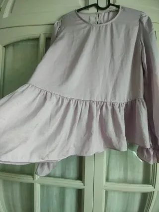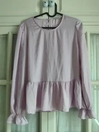 Blusa de manga larga en tono lila con un acabado satinado y detalles de volantes. - Diseño con peplum. - Puños acampanados con volante. - acabado satinado
