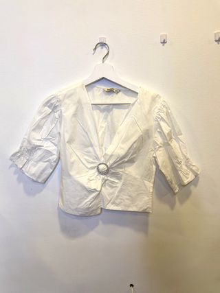 Elegante blusa blanca con un diseño moderno y detalles que la hacen única. - Tejido ligero y cómodo. - Escote pronunciado con nudo. - Adorno circular con pedrería en el centro. - Mangas abullonadas con volante.