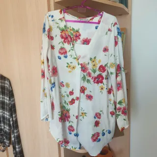 Blusa de Stradivarius con un estampado floral vibrante sobre fondo blanco. Presenta un diseño elegante y ligero, ideal para diversas ocasiones. - Manga larga. - Cuello en V. - Estampado de flores rojas, amarillas y azules.