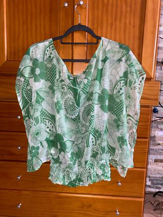 Bonita blusa con un estampado floral y de estilo paisley en tonos verdes y blancos. Tiene un elástico en la cintura que le da forma. - Diseño con escote en V. - Mangas cortas tipo mariposa. - Tejido ligero y fluido.
