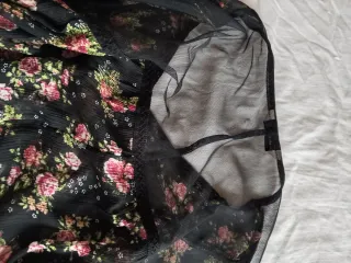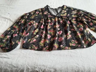 Blusa de Stradivarius con un estampado floral sobre fondo negro. Presenta mangas largas y un escote en pico. - Diseño con flores rosas y detalles blancos. - Tejido ligero y vaporoso. - Mangas abullonadas ,talla pone S pero vale ara M