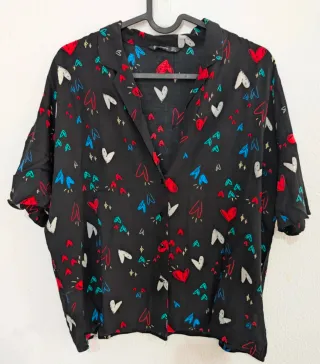 ¡Preciosa y alegre camisa de Stradivarius que no puede faltar en tu armario! Es una blusa de manga corta con un fondo negro muy versátil y un divertido estampado de corazones de estilo "sketch" en colores rojo, blanco, azul y turquesa. En muy buen estado, sin defectos. Tejido muy ligero, fresco y con una caída muy bonita. Ideal para los días de calor. Tiene el cuello con solapas, un corte relajado y fluido. Queda genial tanto cerrada como abierta sobre un top básico. Perfecta para un look casual, para ir a un festival o para tus vacaciones. ¡No dudes en preguntar si tienes cualquier duda o necesitas medidas! 😊