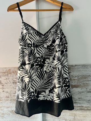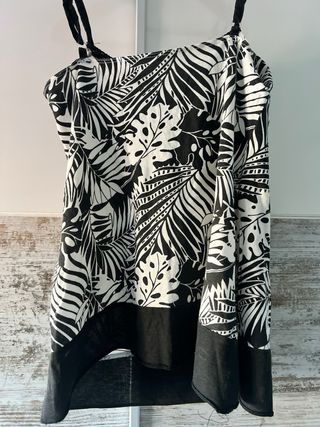 Blusa de tirantes con un llamativo estampado de hojas tropicales en blanco y negro. El diseño presenta un escote en V y un detalle de encaje en el borde. - Estampado de hojas tropicales. - Tirantes finos. - Escote en V con encaje.