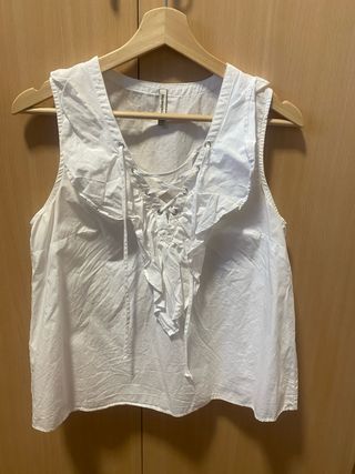Blusa blanca de Stradivarius con un diseño moderno y fresco. - Escote en V con cordones. - Volantes decorativos en el delantero. - Sin mangas.