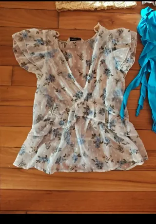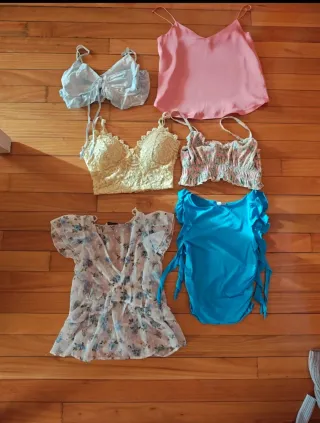 Conjunto de cinco tops para mujer en diferentes estilos y colores. - Top lencero azul con lazada. - Top lencero amarillo de encaje. - Top corto floral con fruncido. - Blusa blanca con estampado floral y volantes. - Top azul con volantes y cordones laterales. Perfecto estado o nuevo talla syxs
