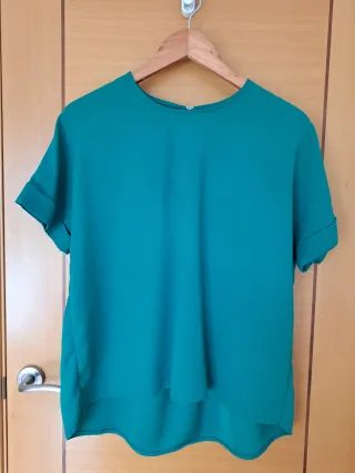 Blusa de Stradivarius en color verde. Manga corta con vuelta. Diseño con bajo asimétrico. Tejido ligero y fluido. Talla S en muy buen estado