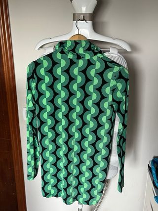Blusa de manga larga con un llamativo estampado geométrico. - Diseño de círculos concéntricos en verde y negro. - Cuello camisero y cierre de botones. - Corte recto.