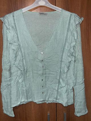 Blusa de Stradivarius over size en color verde, sin estrenar. - Diseño elegante y moderno. - Tejido suave y fluido ligeramente satinado - Cuello camisero. - Cierre de botones. - Manga larga. Talla también para M al ser over size