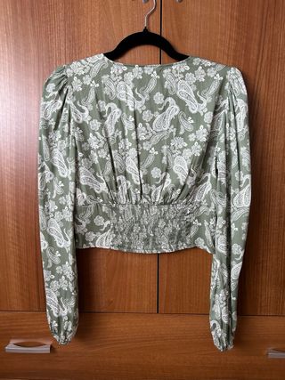 Blusa de manga larga con estampado floral y paisley en tonos tierra, verdes y rojizos sobre fondo beige. Escote en V cruzado con detalle de botones delanteros y goma en los puños. Corte corto y ligeramente ajustado en la cintura, ideal para un look boho o casual chic. Muy poco uso, como nueva. Medidas: - Hombros 35cm - Axila 40cm - Largo 40cm