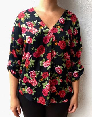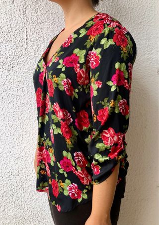 Blusa de media manga de color negro con motivos florales. Escote elegante en V y mangas de altura ajustable. Corte ancho y marcado en la zona del pecho, favoreciendo la figura. Prenda con poco uso y bien conservada. En perfectas condiciones, cómoda para entretiempo y principios de invierno. Colores sobre negro de tonalidades rojizas y verdes. Perfecta para el uso diario y para ocasiones más formales. Textura muy agradable y ligera. Marca: Stradivarius Talla: L Material: 100% Poliéster