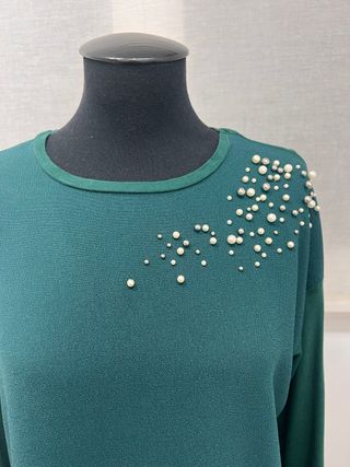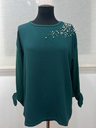 Camisa verde con piedras. Está perfecto sin ninguna imperfección. La manga 3/4 con lazos. Talla L . Las medidas son: de hombro a hombro 56 cm, de axila a axila 57 cm, manga 35 cm, largo 62 cm