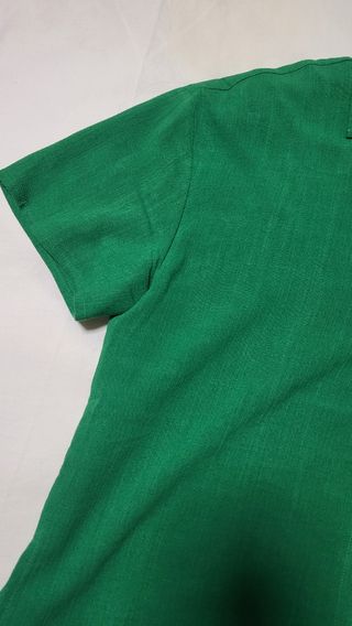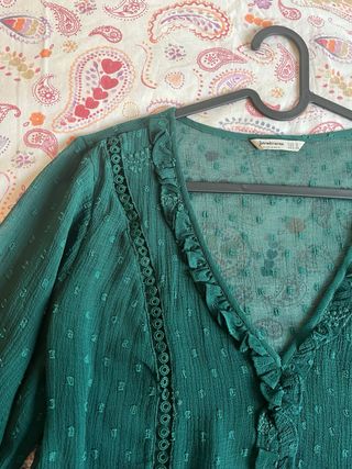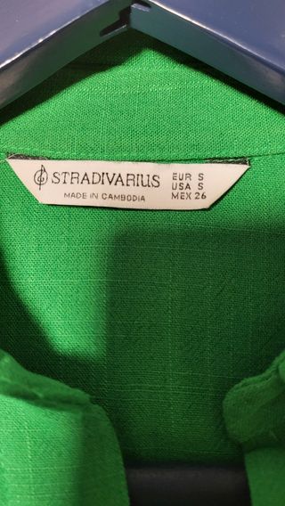 Talla 38 de Stradivarius aunque tiene las etiquetas cortadas. Color verde botella muy bonito. Es de poliéster, no se arruga, tiene un tacto suave. Las mangas pueden remangarse. Medidas: Largo 65 cms. ancho de axila a axila 46 cms. No se ha llegado a usar.