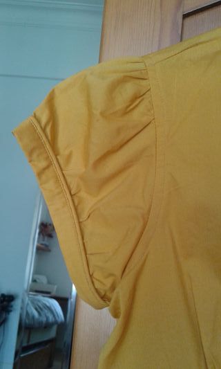 Blusa de manga francesa en color mostaza de Stradivarius Es una S amplia, que vale a una M (comprueba las medidas en fotos. Escote en pico. Buen estado sin desperfectos
