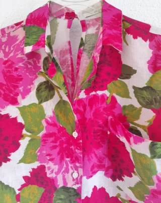 Camisa de manga larga con estampado floral vibrante. - Diseño con flores grandes en tonos rosas y detalles verdes. - Cuello camisero. - Cierre de botones. - Bolsillo en el pecho.