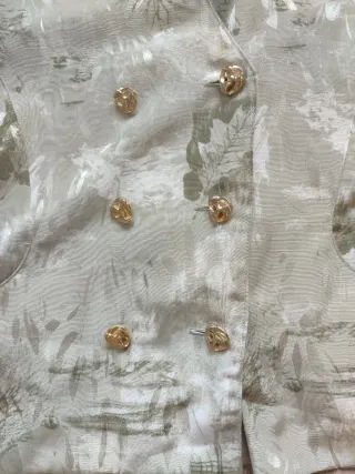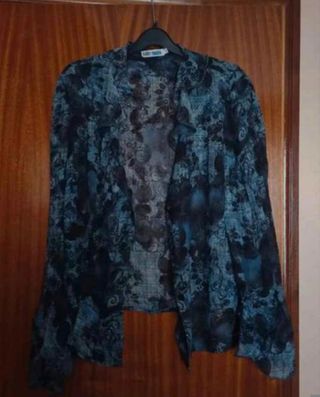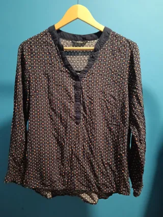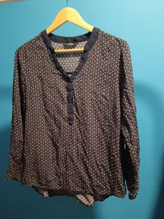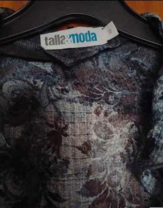 Blusa camisa estampada vintage tonos azules y grises. botones dorados con perlita morada talla 48. Tela calidad de boutique, fabricación española. perfecto estado lavable a 40° envío por wallapop o por privado previo pago del coste por PayPal o bizum (3'10). NO NEGOCIABLE
