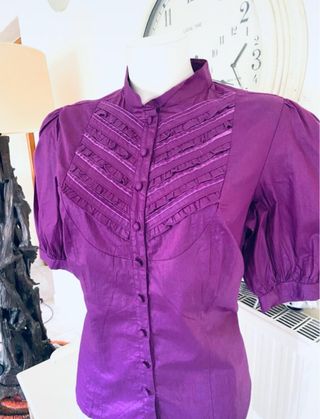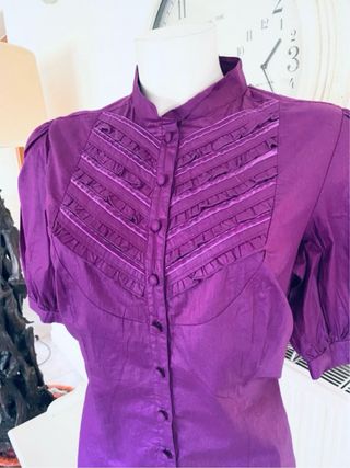 Preciosa blusa vintage en un elegante morado oscuro, de los años 80 y principios de los 90. La blusa presenta cuello cerrado, refinados volantes y pliegues en el busto, y encantadoras mangas cortas abullonadas, creando un look femenino y atemporal. Su corte entallado se adapta con elegancia y luce un estilo chic y vintage. Perfecta para combinar con pantalones de cintura alta, falda o debajo de un blazer. Tejido brillante. Una prenda que marca tendencia para los amantes del estilo vintage y retro chic.