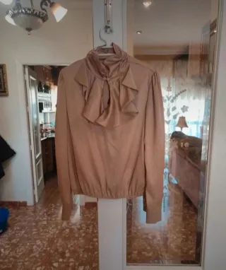 Elegante blusa vintage de color camel, con un diseño que evoca un estilo clásico y sofisticado. Perfecta para añadir un toque chic a tu armario. Aunque la etiqueta marca M realmente corresponde por las medidas que indico a XS o XXS. (centímetros de hombro a hombro 35). Última tendencia. - Cuello con lazada. - Mangas largas abullonadas. - Cintura elástica fruncida.