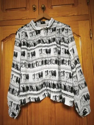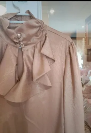 Elegante blusa satinada de estilo vintage, con un diseño único y detalles que la hacen especial. Originalmente costó 120€. - Cuello alto con volantes. - Cierre de botón en la parte delantera. - Puños ajustados.