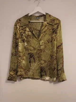 Blusa de estilo vintage con un llamativo estampado marrón y verde La talla es más pequeña de lo que pone recomiendo para una M/L - Diseño con cuello camisero. - Manga larga. - Cierre de botones.