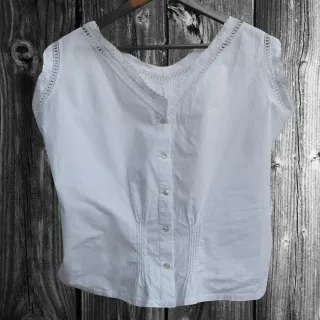 Blusa vintage con detalles de encaje/cubre corsé victoriano - Cuello en V con borde de encaje. - sin Mangas con detalle de encaje. - Cierre de botones de nacar al frente. - Adornos de puntillas y plisados. -Cintura con ajuste ✨Su estado general es bueno vintage, aunque algunas lorzas de la cintura se descosieron, no afecta para nada a la estética del corpiño que puesto no se aprecia. Medidas: Pecho: 46 cm Largo máximo: 62,5 cm